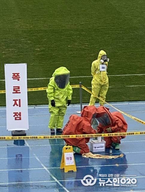 (뉴스인020 = 기자) 수원시 장안구보건소는 24일 수원종합운동장에서 수원장안경찰서, 수원소방서 등 유관기관과 함께 ‘2025년 생물테러 대응 대규모 합동훈련’을 했다.