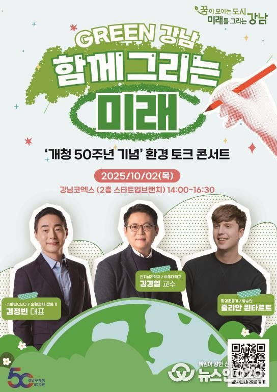 (뉴스인020 = 김성길 기자) 꿈이 모이는 도시, 미래를 그리는 강남구가 개청 50주년을 기념해 오는 10월 2일 오후 2시 코엑스 스타트업브랜치에서 ‘GREEN 강남, 함께 그리는 미래’를 주제로 ‘환경 토크 콘서트’를 개최한다.