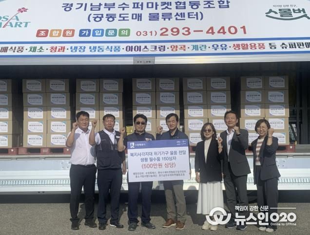 경기남부수퍼마켓협동조합은 지난 9일 행정안전부 스마트복지안전공동체추진단, 중소기업중앙회사랑나눔재단, 한국수퍼마켓협동조합연합회와 업무협약을 체결하고, 민관이 함께 위기가구 지원체계를 강화하기로 약속했다. 이번 기부는 업무협약의 하나로 이뤄졌다.