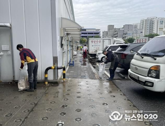 도매시장 보도와 차도, 지상·지하 주차장, 녹지공간, 흡연부스 등 이용객이 많이 찾는 구역을 청소했다. 법인·조합별로 책임 구역을 나눠 쓰레기를 수거했다.