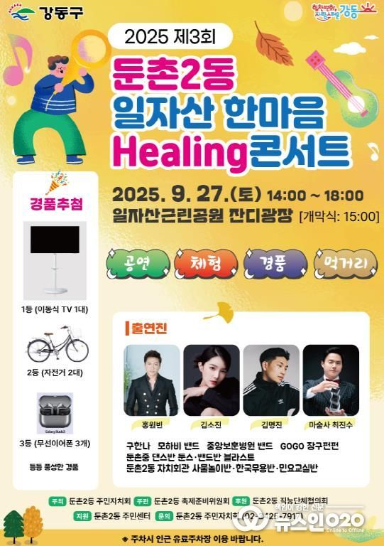 (뉴스인020 = 김성길 기자) 강동구 둔촌2동은 오는 27일 일자산근린공원 잔디광장에서 ‘제3회 둔촌2동 일자산 한마음 Healing 콘서트’를 개최한다고 밝혔다.