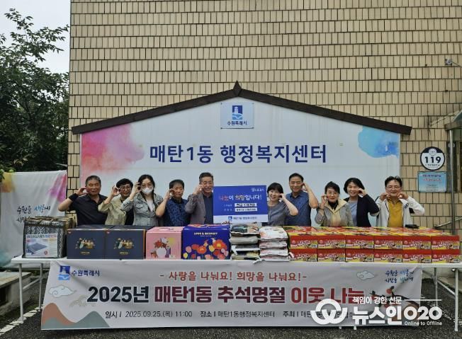(뉴스인020 = 기자) 25일 수원특례시 영통구 매탄1동은 추석 명절을 맞이하여 관내 저소득층 300여 세대에 후원물품을 전달하는 이웃돕기 나눔 전달식을 개최했다.