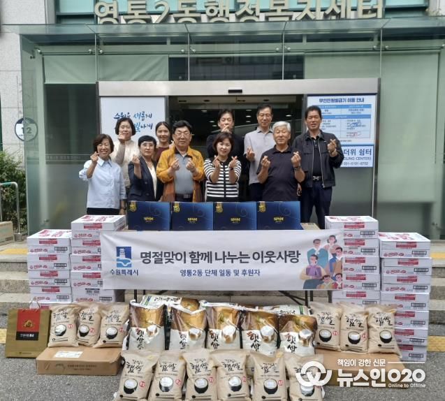 (뉴스인020 = 기자) 수원시 영통구 영통2동 단체장협의회와 행정복지센터는 지난 25일 추석 명절을 맞이해 각종 단체와 기관 등에서 후원한 다양한 물품(백미, 스팸선물세트, 온누리상품권, 라면 등)들을 관내 어려운 이웃들에게 전달하는 ‘이웃사랑 나눔 전달식’을 진행했다.