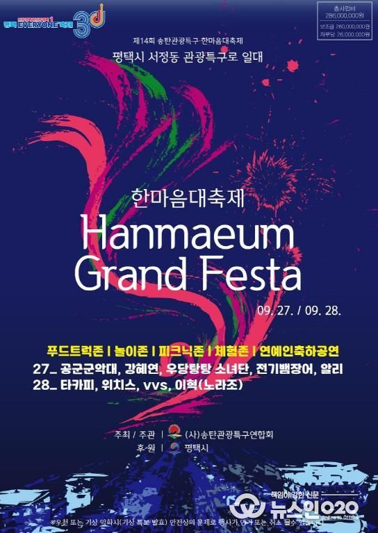 (뉴스인020 = 김성길 기자) 사단법인 송탄관광특구연합회가 주최·주관하는 ‘제14회 송탄관광특구 한마음대축제’가 오는 27일(토)과 28일(일) 양일간 송탄출장소 앞 송탄관광특구 일대에서 성대하게 열린다.