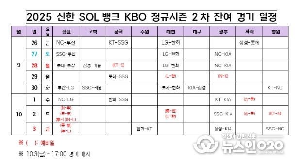 (뉴스인020 = 김민석 기자) KBO는 26일(금) 2025 신한 SOL뱅크 KBO 정규시즌 2차 잔여 경기 일정을 확정했다.