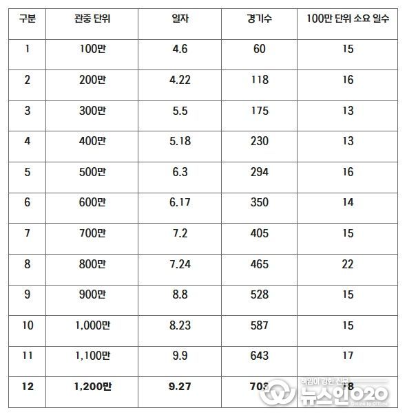 (뉴스인020 = 김민석 기자) 2025 신한 SOL뱅크 KBO 리그가 1,200만 관중을 달성했다.