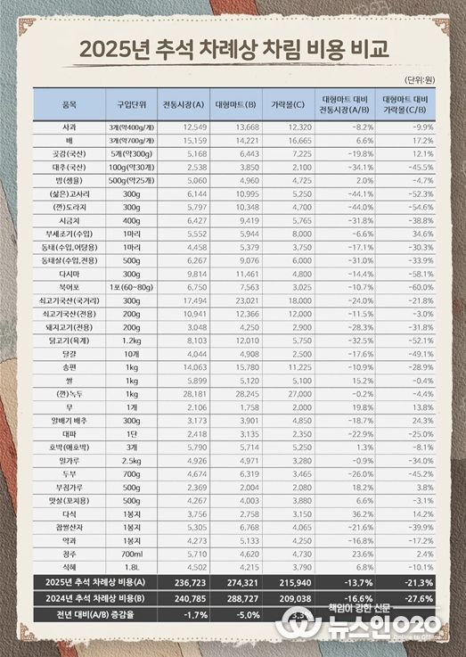 서울시농수산식품공사, `2025년 추석 차례상 차림 비용` 조사 결과 발표…가락몰, 대형마트 대비 21.3% 저렴