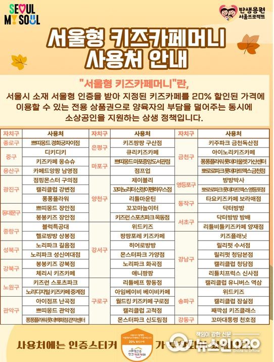 (뉴스인020 = 김성길 기자) 열흘 안팎의 긴 추석연휴를 앞두고 아이들과 양육자가 보다 부담 없는 가격으로 키즈카페에서 즐거운 연휴를 보낼 수 있도록 서울시가 20% 할인 혜택이 있는 ‘서울형 키즈카페머니’ 11억 원을 추가 발행한다고 밝혔다.
