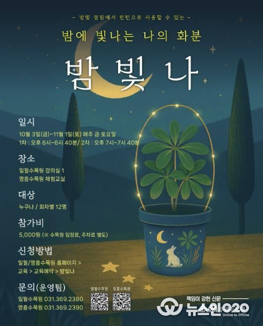 (뉴스인020 = 기자) 수원특례시는 일월·영흥 수목원에서 10월 3일부터 11월 1일까지 매주 금·토요일 야간에 열리는 행사 ‘밤빛정원’에서 다양한 체험 프로그램들을 운영한다.