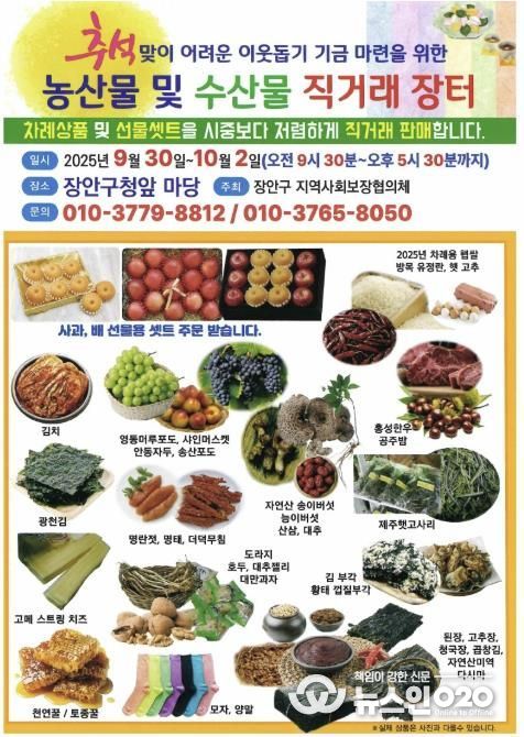 (뉴스인020 = 기자) 수원시 장안구 지역사회보장협의체는 민족 최대의 명절 추석을 맞아 오는 9월 30일부터 10월 2일까지 3일간 장안구청 앞 광장에서 ‘추석맞이 농수산물 직거래장터’를 개최한다.