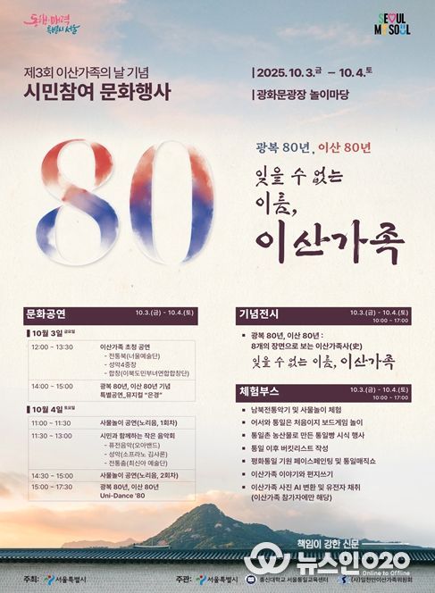 (뉴스인020 = 김성길 기자) 서울시는 오는 10월 3일부터 10월 4일까지 광화문광장 놀이마당에서 제3회 이산가족의 날을 맞아 시민참여 문화행사를 개최한다.
