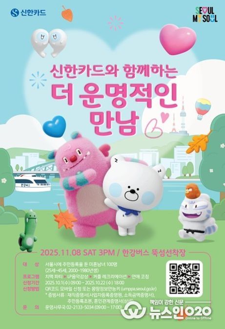 (뉴스인020 = 김성길 기자) 서울시가 ‘더 운명적인 만남’이라는 새 이름과 함께 올해 마지막 미혼남녀 만남행사를 개최한다. 서울시는 오는 11월 8일 ‘신한카드와 함께하는 더 운명적인 만남’을 개최한다고 밝히고, 참가자 모집을 위한 신청 접수를 시작한다.