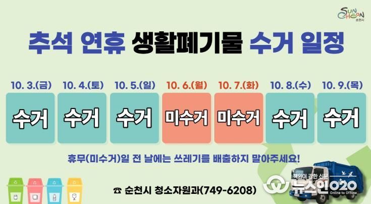 (뉴스인020 = 김성길 기자) 순천시는 추석 연휴 기간 생활폐기물로 인한 시민 불편을 최소화하고, 쾌적한 도시 환경을 조성하기 위해 ‘추석 연휴 생활폐기물 수집․운반’을 안정적으로 추진한다.