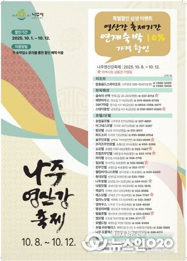 (뉴스인020 = 김성길 기자) 전라남도 나주시가 오는 10월 8일부터 12일까지 열리는 ‘2025 나주영산강축제’ 기간 동안 지역 숙박업소와 함께하는 숙박 특별할인 상생 이벤트를 마련했다.