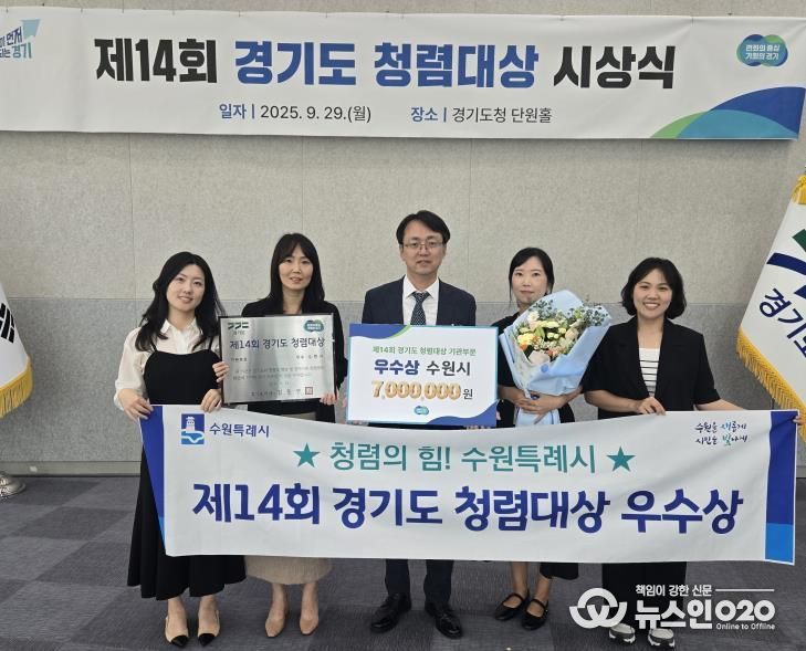 (뉴스인020 = 기자) 수원특례시가 제14회 경기도 청렴대상에서 우수상으로 선정됐다. 시상식은 29일 경기도청 단원홀에서 열렸다.
