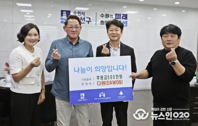 (뉴스인020 = 기자) 수원시 권선구는 지난 29일, 관내 기업 다원에서 후원금 오백만원을 기탁했다고 밝혔다.