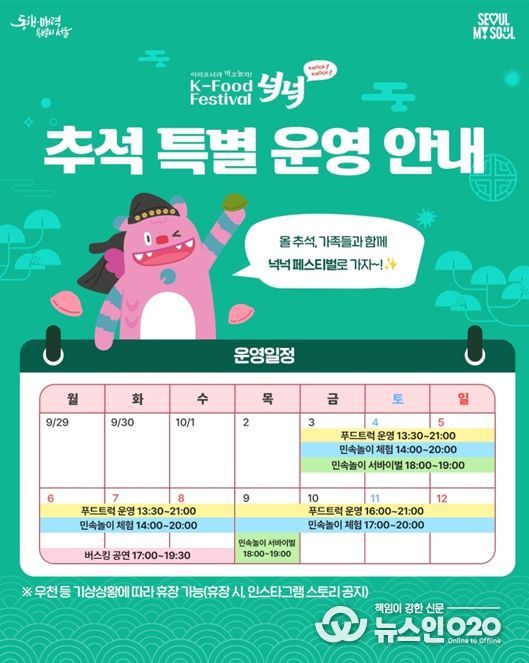 (뉴스인020 = 김성길 기자) 전 세계를 휩쓴 케데헌(케이팝데몬헌터스) 열풍이 한국 음식 문화까지 확산되는 가운데, 서울시는 이를 한자리에서 즐길 수 있는 ‘K-푸드 페스티벌 넉넉’을 올 추석 연휴 동안 확대 운영하며, 명절 분위기를 더하는 전통놀이와 공연 프로그램을 선보인다고 밝혔다.