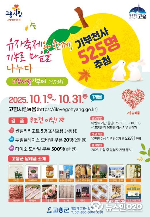 (뉴스인020 = 김성길 기자) 고흥군은 고향사랑기부제 10억 원 달성을 기념해 마련한 특별 이벤트를 10월 한 달간 운영한다고 밝혔다.