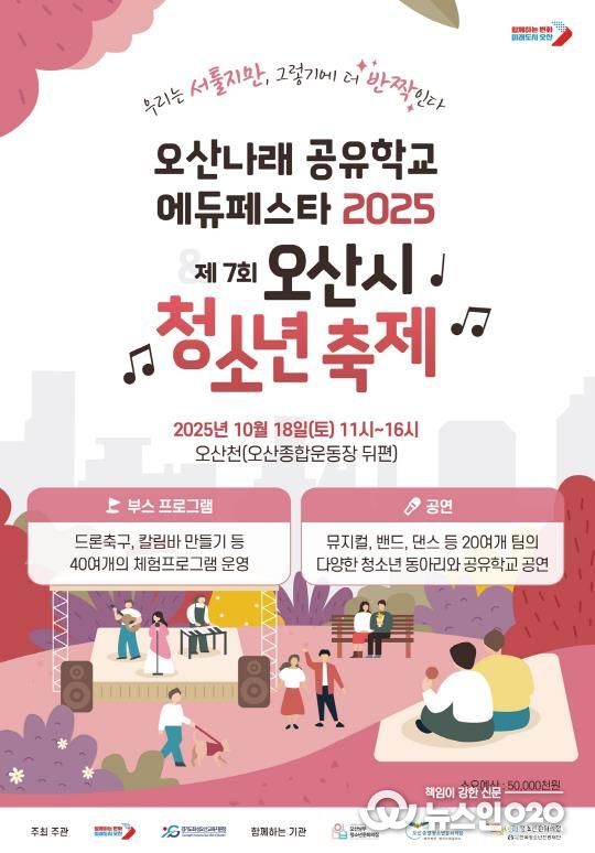 (뉴스인020 = 김성길 기자) 오산시는 오는 10월 18일 오전 11시부터 오후 4시까지, 오산종합운동장 뒤편 오산천 잔디밭에서 화성오산교육지원청과 공동으로 ‘오산나래공유학교 에듀페스타 2025 · 제7회 오산시 청소년 축제’를 개최한다고 밝혔다.