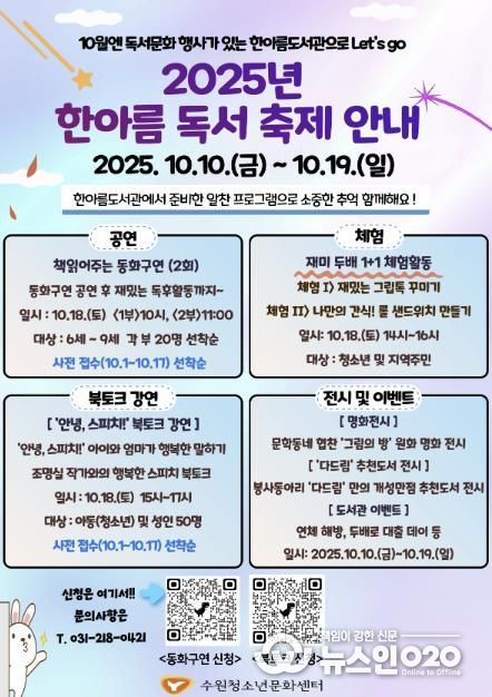 (뉴스인020 = 기자) 수원시청소년청년재단 수원청소년문화센터 한아름도서관은 2025. 독서의 달을 기념하여‘한아름독서축제’를 10월 10일부터 10월 19일까지 운영한다.