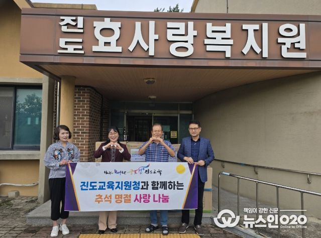 (뉴스인020 = 김성길 기자) 진도교육지원청은 9월 29일 다가오는 추석 명절을 맞아 지역 내 사회복지시설 2곳(효사랑복지원, 카리타스노인복지센터)을 방문해 정성을 담아 준비한 위문품을 전달하며 따뜻한 이웃사랑을 실천했다.