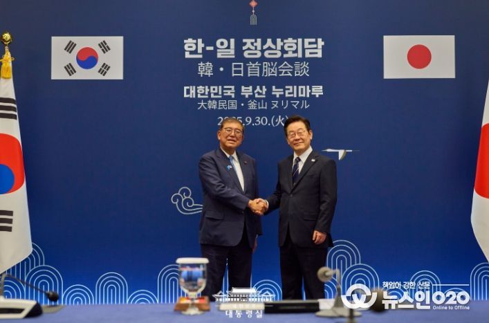(뉴스인020 = 김성길 기자) 이재명 대통령은 9월 30일 '이시바 시게루(石破 茂)' 일본 총리와 부산에서 한일 정상회담을 가졌다. 양 정상은 한일 간 실질 협력 강화 방안과 지역 및 글로벌 차원에서의 협력 필요성에 대해 폭넓고 심도 깊은 의견을 교환했다.