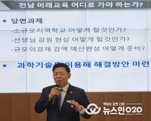 이어 김 위원장은 전남 교육이 직면한 소규모 학교 운영, 교원 감축, 예산 부족 등 구조적 한계를 진단하며, 이에 대한 대안으로 ‘2030 미래 교실’ 비전을 제시했다.