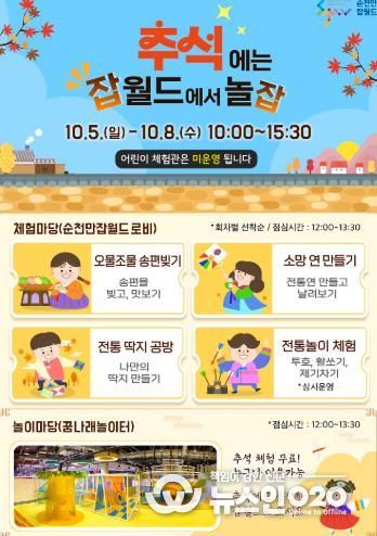 (뉴스인020 = 김성길 기자) 순천시는 오는 10월 5일부터 8일까지 추석 연휴를 맞아 순천만잡월드에서 '추석에는 잡월드에서 놀JOB~'이벤트를 개최한다.