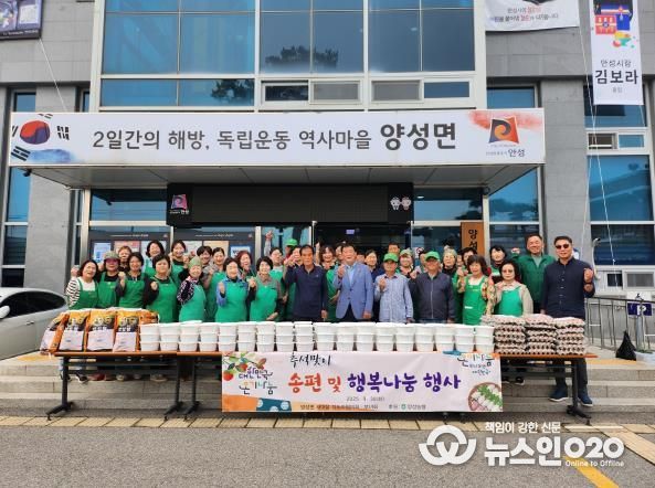 (뉴스인020 = 김성길 기자) 양성면새마을지도자․부녀회는 9월 30일 양성면 행정복지센터 앞 주차장에서 “추석맞이 송편 행복 나눔” 행사를 진행했다. 이번 행사는 민족 최대 명절인 추석을 맞아 지역 내 취약계층에게 따뜻한 정을 나누고, 모두가 풍성한 한가위를 보낼 수 있도록 돕기 위해 마련됐다.
