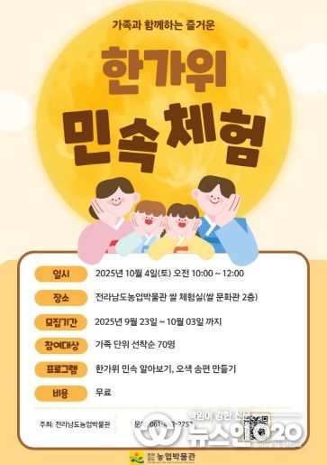(뉴스인020 = 김성길 기자) 전라남도 농업박물관은 다가오는 한가위를 맞아 가족 단위 관람객 대상으로 ‘한가위 민속 체험행사’를 10월 4일에 개최한다고 밝혔다.