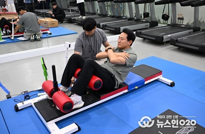 오 시장은 키‧몸무게, 체성분 검사 후 윗몸일으키기, 제자리멀리뛰기 등을 직접 해보며 근력, 근지구력, 유연성, 심폐지구력, 민첩성 및 순발력 등을 측정했다.