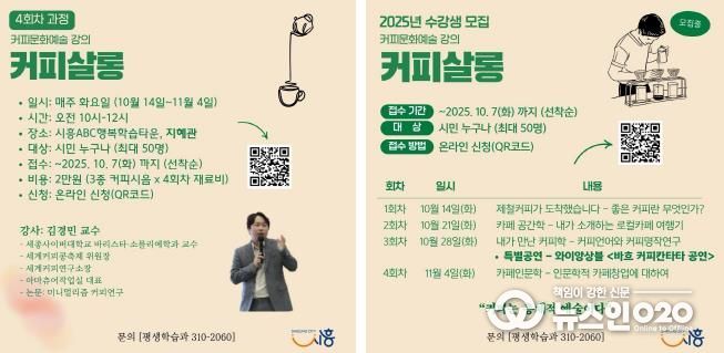(뉴스인020 = 김성길 기자) 시흥시는 민간주도형 지역축제 지원사업인 ‘2025년 시흥시 지역특화 관광축제 지원사업’에 선정된 ‘세계 커피콩 축제’의 사전 연계 프로그램으로 커피문화예술 특강 ‘커피살롱’을 오는 10월 14일부터 11월 4일까지 시흥ABC행복학습타운 지혜관에서 총 4회에 걸쳐 진행한다.