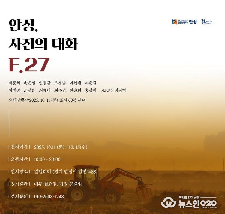 (뉴스인020 = 김성길 기자) 안성시 사진동아리 F.27 photo가 오는 10월 11일부터 15일까지 안성천 작은미술관 결갤러리에서 전시회 ‘안성, 사진의 대화 F.27’을 개최한다. 이번 전시는 동아리 회원 18명이 참여해 안성의 자연환경과 사람들의 이야기를 기록한 작품을 선보인다.