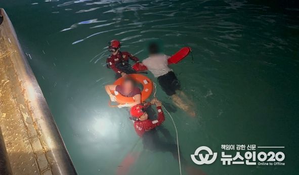 (뉴스인020 = 김성길 기자) 완도해양경찰서(서장 김길규)는 10월 7일 새벽, 완도항 인근 해상에서 술에 취해 바다로 뛰어든 여성과 이를 구하려고 함께 바다에 들어간 일행 등 2명을 신속히 구조했다고 밝혔다.