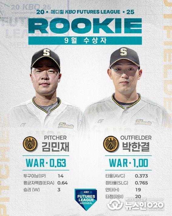 (뉴스인020 = 김민석 기자) 2025 메디힐 KBO 퓨처스리그의 9월 퓨처스 루키상 수상자로 투수 부문에는 상무 김민재가 WAR 0.63, 타자 부문에는 상무 박한결이 WAR 1.00을 기록하며 각각 선정됐다.