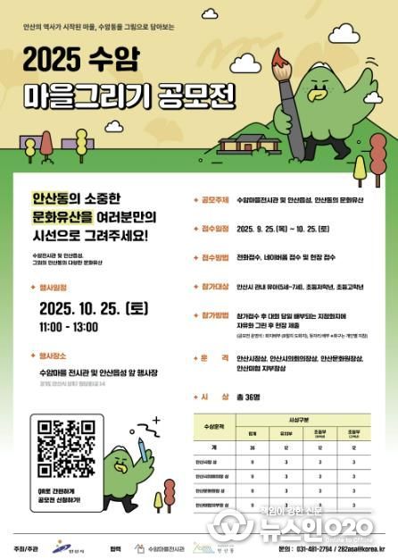 공모전은 관내 유아(5~7세)·초등부(저학년)·초등부(고학년) 등으로 구분돼 열린다. 그리기 공모전 주제는 ▲수암마을전시관 ▲안산읍성 ▲안산동의 문화유산이다.