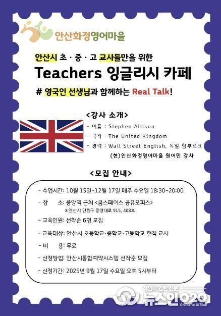 (뉴스인020 = 김성길 기자) 안산시 안산화정영어마을은 오는 15일부터 12월 17일까지 관내 소속 교사를 대상으로 ‘티처스(Teachers) 잉글리시 카페’를 운영한다고 10일 밝혔다.
