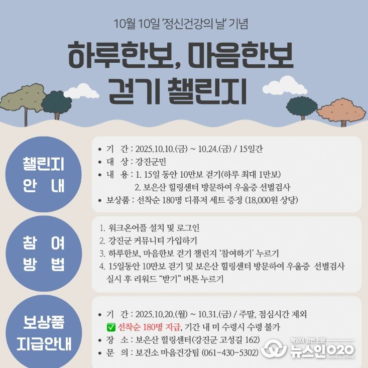 (뉴스인020 = 김성길 기자) 강진군보건소가 지난 10일 정신건강의 날을 기념해 군민 마음 건강을 위한 ‘하루 한보, 마음 한보 걷기 챌린지’를 운영중이다.