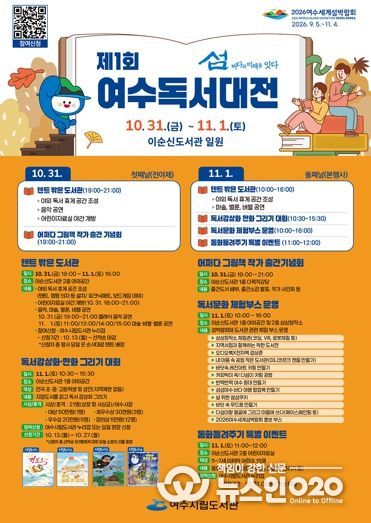 (뉴스인020 = 김성길 기자) 여수시는 오는 10월 31일부터 11월 1일까지 이틀간 이순신도서관 일원에서 ‘제1회 여수독서대전’을 개최한다.