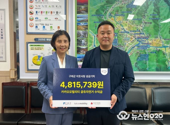 (뉴스인020 = 김성길 기자) 카카오모빌리티가 지난 9월 30일 구례군과의 공유자전거 이용 활성화를 위한 업무 협약의 일환으로 공유자전거 수익금 4,815,739원을 구례군에 기탁했다고 밝혔다.