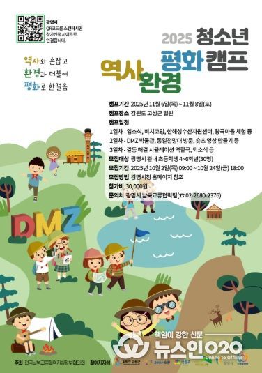 (뉴스인020 = 김성길 기자) 광명시는 전국남북교류협력지방정부협의회가 주최·주관하는 ‘2025 청소년 역사·평화·환경캠프’에 참가할 청소년을 모집한다.