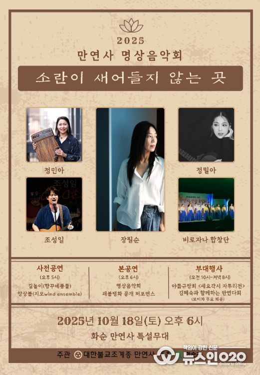 (뉴스인020 = 김성길 기자) 화순군은 오는 18일 저녁 6시 ‘2025 만연사 산사음악회’가 만연사 특설무대에서 개최된다고 밝혔다.