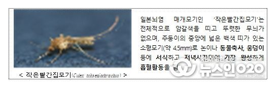 일본뇌염 매개모기인 작은빨간집모기는 암갈색 소형 모기로 주로 야간에 흡혈활동을 하고, 우리나라 전 지역에서 10월까지 활동하는 것으로 관찰된다. 일본뇌염 매개모기 감시 결과 9월말 기준(39주차) 평균 108개체로 지속적으로 발생하고 있으므로, 모기 물림에 주의하고, 증상 발현 시 신속하게 의료기관을 방문하여 진단 및 치료를 받아야 한다.