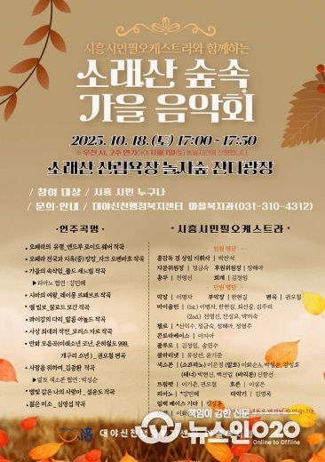 (뉴스인020 = 김성길 기자) 시흥시 대야ㆍ신천행정복지센터는 오는 10월 18일 소래산 삼림욕장 놀자숲 잔디광장에서 대야ㆍ신천동 지역 주민을 위한 ‘소래산 숲속 가을 음악회’를 개최한다.