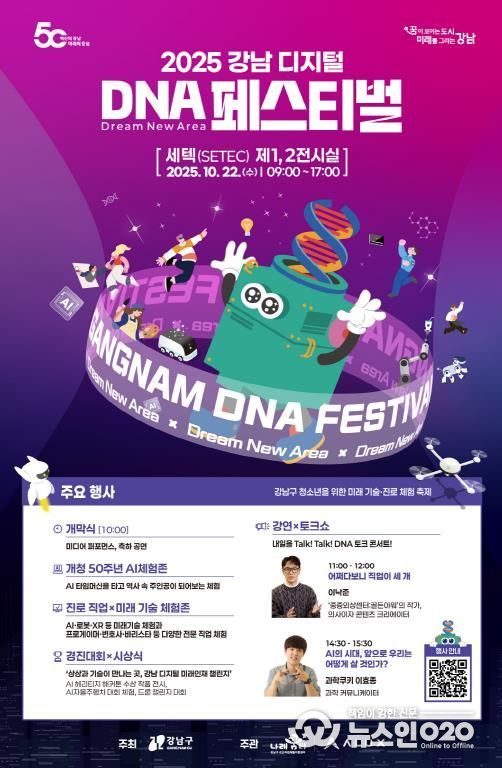 (뉴스인020 = 김성길 기자) 꿈이 모이는 도시, 미래를 그리는 강남구가 오는 10월 22일 오전 9시부터 오후 5시까지 세텍(SETEC) 제1‧2전시실에서 ‘2025 강남 디지털 DNA(Dream New Area) 페스티벌’을 개최한다.