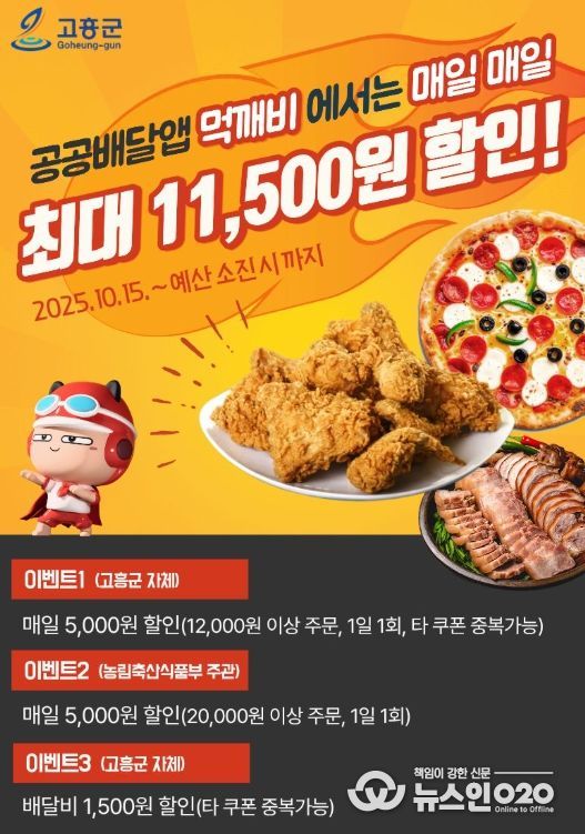 (뉴스인020 = 김성길 기자) 고흥군은 군민의 외식비 부담을 줄이고 소상공인 경영지원을 위해 15일부터 공공배달앱 ‘먹깨비’에서 외식비 ‘반값’ 이벤트를 진행한다고 밝혔다.