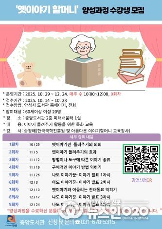 (뉴스인020 = 김성길 기자) 안성시 중앙도서관은 오는 10월 29일부터 12월 24일까지 매주 수요일 오전 10시부터 12시까지(총9회) 진행되는 『옛이야기 할머니』양성과정의 수강생을 모집한다.