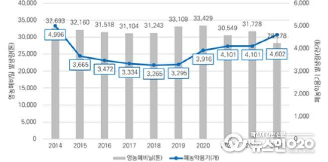 2023년 기준 경기도 영농폐기물 발생량은 영농 폐비닐이 약 3만 톤(93%), 폐농약 용기가 약 460만 개(94%)로 나타났다.