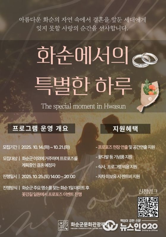 모집은 10월 14일(화)부터 10월 21일(화) 18:00까지로 화순군 외 지역에 거주하며 프로포즈를 계획 중인 커플 1팀을 모집한다. 신청은 별도의 폼 작성을 통한 온라인 접수로 가능하며, 최종선정자는 10월 22일(수) 개별 안내 예정이다.