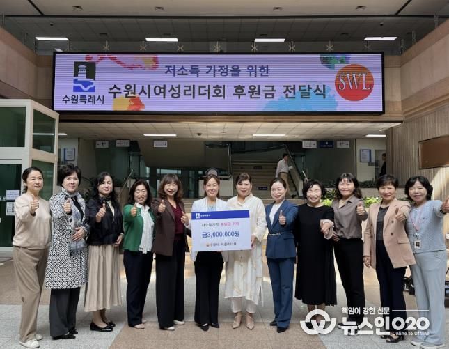 (뉴스인020 = 기자) 수원시여성리더회가 16일 수원시청 본관 1층에서 저소득가정을 위한 후원금 300만 원을 수원시에 전달했다. 후원금은 형편이 어려운 가정에 지원할 예정이다.